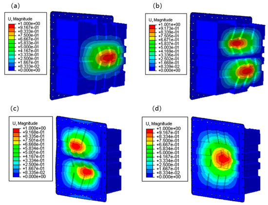FEA results of Eigenvalue buckling loading: (a) first-order instability loading with 390.021 kN; (b) second-order instability loading with 406. 090 kN; (c) third-order instability loading with 509.240 kN; (d) fourth-order instability loading with 587.500 kN.