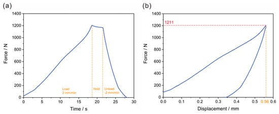 Experimental verification of the suspended static bottom loading condition: (a) relationship between time–force curve, and (b) relationship between displacement–force curve.
