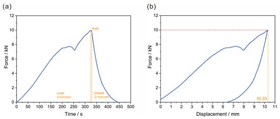 According to the settings in Section 2.6.2, the designed lightweight CFRP battery pack enclosure was subjected to experimental verification of the lateral loading condition. The results are shown in Figure 17, in which the two plots above illustrate the force-time and force-displacement curves. Figure 17a presents the force-time characteristics of the lightweight CFRP battery enclosure during the loading-holding-unloading cycle. In the loading phase (0–320 s), with a constant loading rate of 2 mm/min, the force increased with minor fluctuations. Around 320–340 s, the force reached a peak and remained relatively stable, implying that the structure temporarily balanced internal stresses under constant displacement. Subsequently, in the unloading phase (after 340 s) at a rate of −2 mm/min, the force declined sharply, which reflected the release of elastic and some inelastic deformations.
