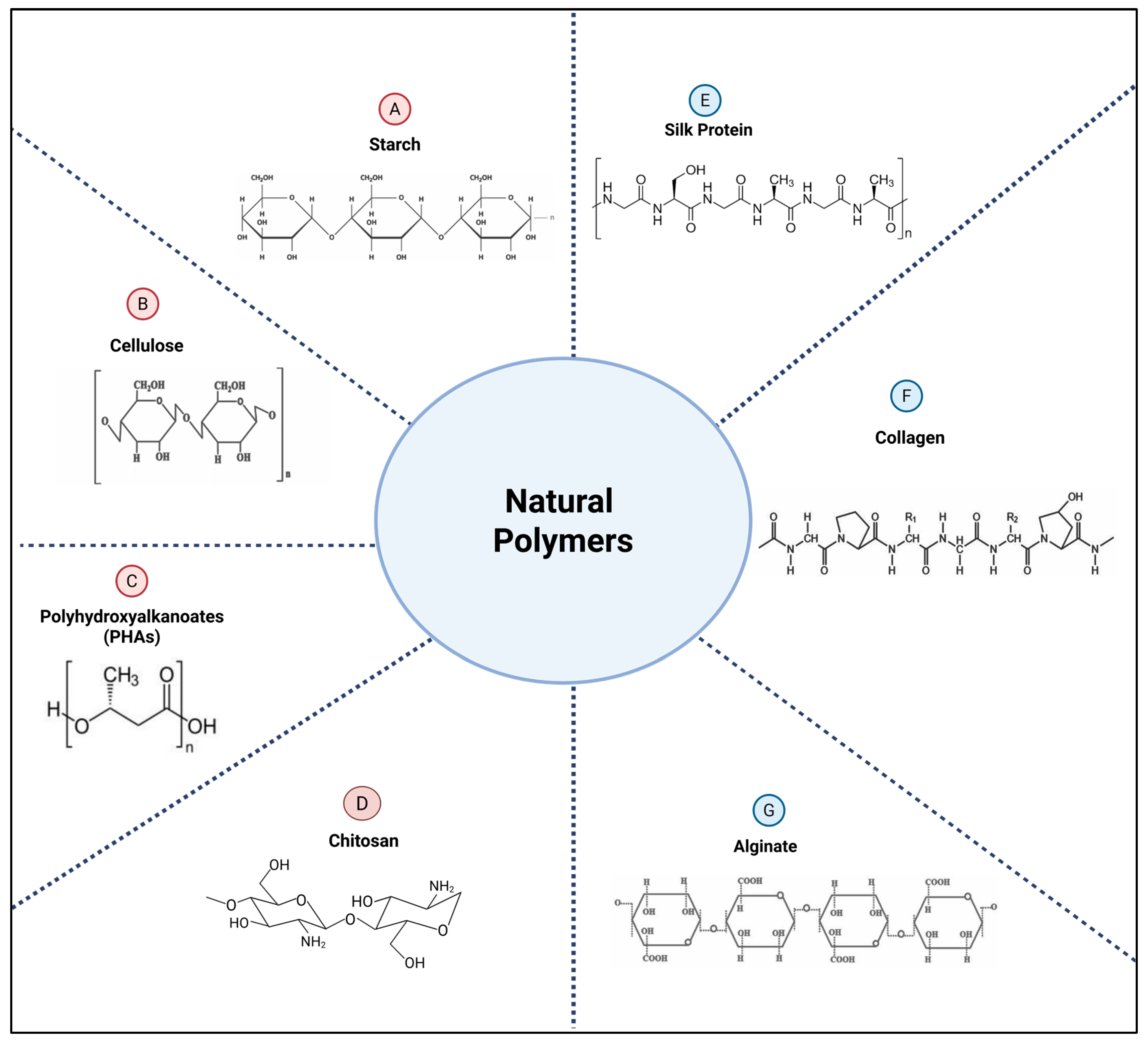 | Starch | Poor mechanical strength; reinforced with fiber matrix or by chemical or physical modification | Fast; temperature dependent | Biocompatible and biodegradable | Moisture absorbance and mechanical failure | [10,27] |