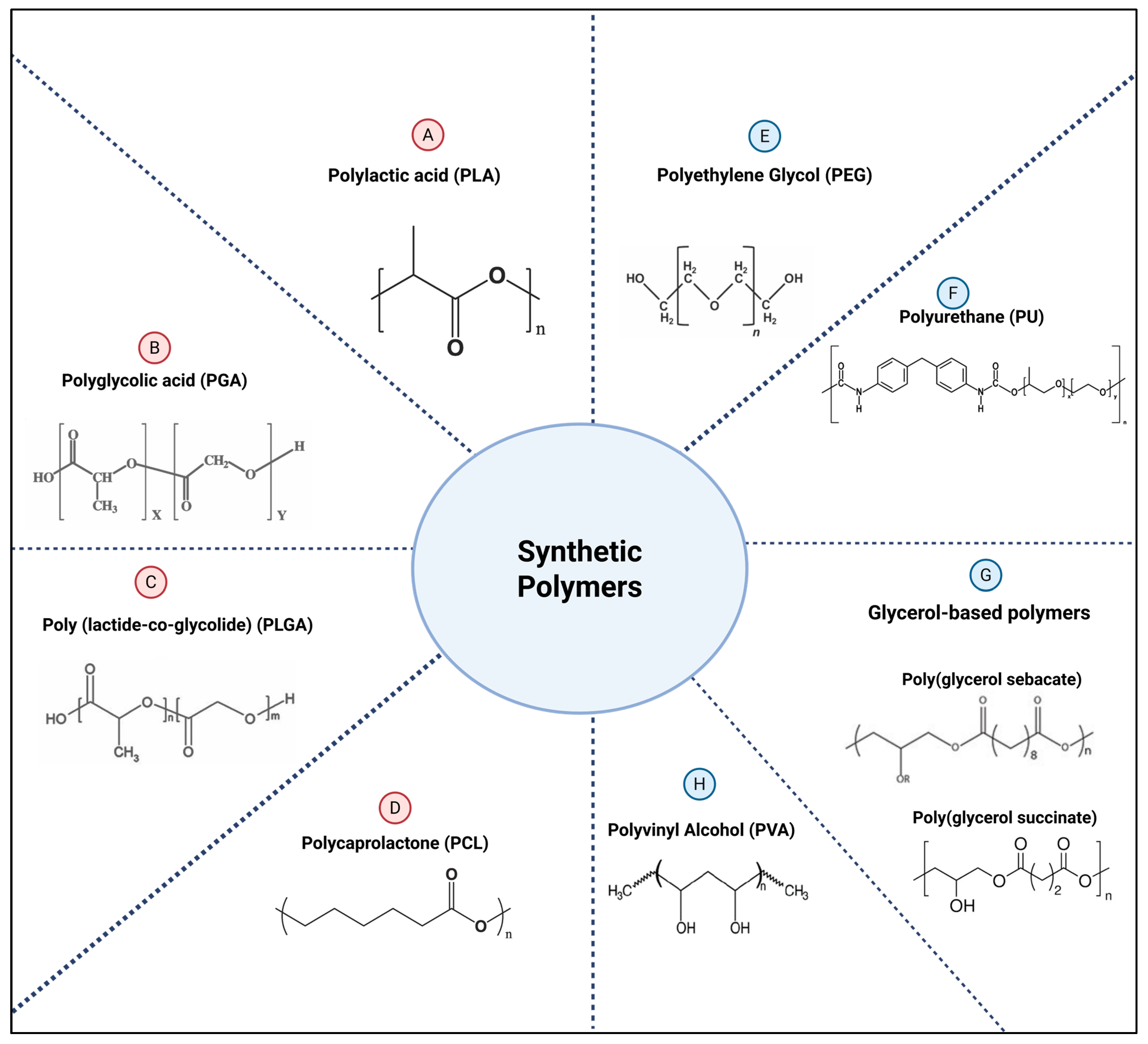 | Collagen, gelatin, hyaluronic acid, chitosan, alginate (natural); PLA, PGA, PCL, PLGA, PU, polyphosphazenes (synthetic) | Support cell adhesion, tunable degradation, and mechanical strength | Hydrogels, electrospun fibers, 3D-printed scaffolds, nanocomposites | Tissue engineering (bone, cartilage, neural, skin, vascular, cardiac) | [216,217,219,220,221,222,223] |