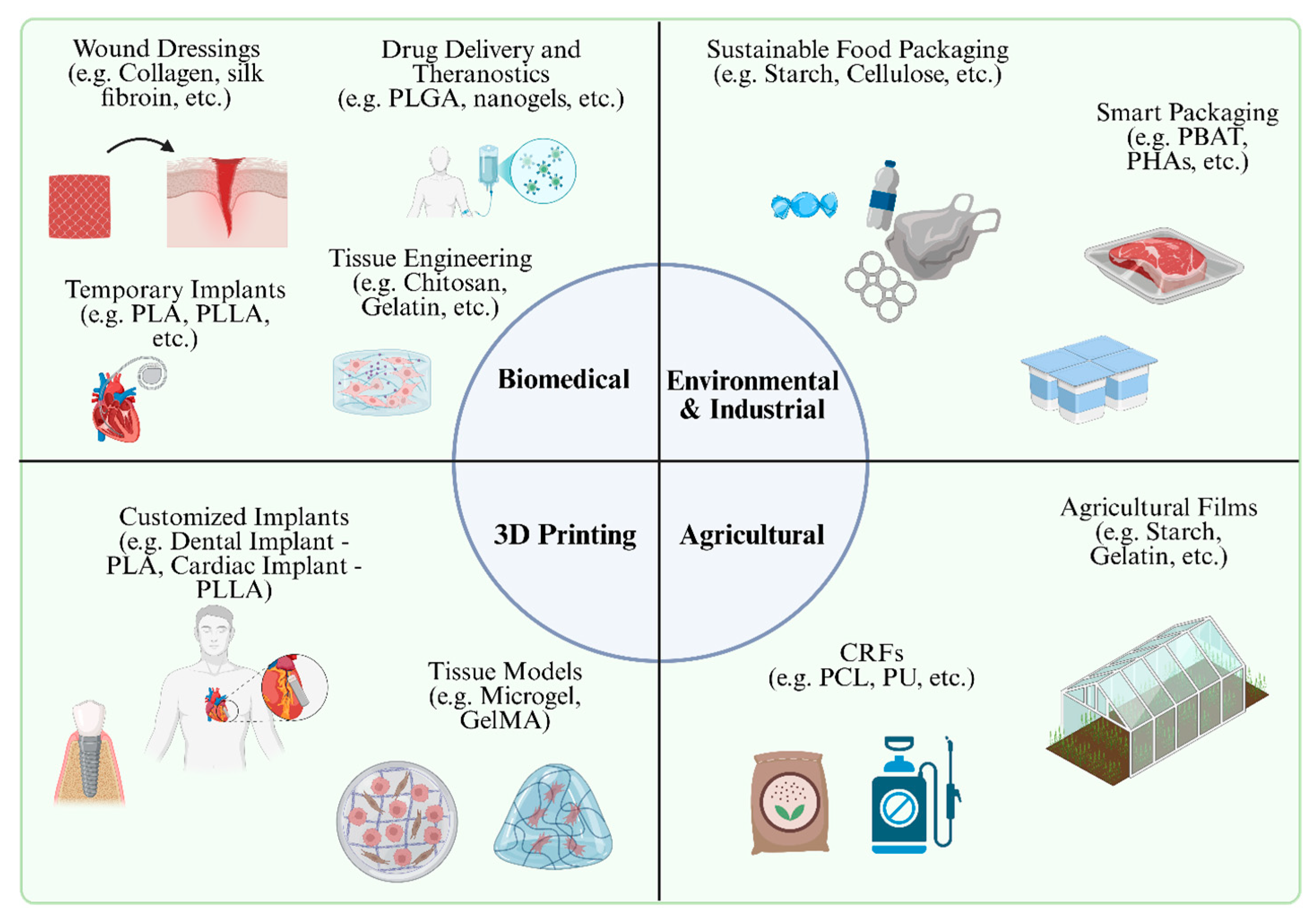 | Starch, cellulose, PVA, PLA, chitosan, gelatin, gum Arabic, PU, PCL coatings | Moisture retention, nutrient-controlled release, soil biodegradability | Mulch films, hydrogels, coatings, nanocarriers | Agricultural films, controlled-release fertilizers, pesticide carriers, biosorbents | [272,273,274,275,276,277,278,279,280,281,283,284,285,286,287,288,289,290,291,292,293,294,295,296,338,339,340,341,342,343,344,345,346,347,348,349,350,351,352,353,354,355,356,357,358,359,360,361,362] |