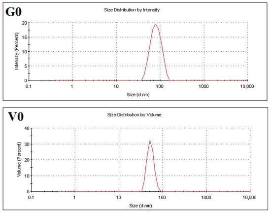 The particle size distributions of the dispersions were characterized by dynamic light scattering (DLS), and the results are summarized in Figure 1 and Table 4. The G0 dispersion exhibited a Z-average particle diameter of 82 nm with a polydispersity index (PDI) of 0.145, while the V0 dispersion showed a smaller average particle size of 53 nm with a PDI of 0.088. These data indicate that both systems consist of fine particles with narrow and relatively uniform size distributions, confirming the successful preparation of stable, nanoscale reactive latexes suitable for subsequent PA incorporation and leather finishing applications.