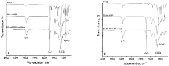 The FTIR spectra of the copolymers and their corresponding reactive monomers are presented in Figure 2. To verify the incorporation of the reactive monomers into the copolymer structure, a reference BA-co-MMA copolymer was synthesized under identical conditions without any reactive monomer. Its spectrum was recorded for comparison alongside those of the functional monomers.