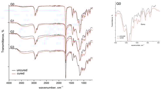 Figure 4 represents IR spectra G-series reactive copolymer-PA blends before and after curing process. For the unmodified binder (G0), the FTIR spectrum exhibits a distinct absorption band at 908 cm−1, attributed to the epoxy ring stretching of glycidyl methacrylate units. This peak remains visible even after the curing process at 100 °C for 30 min, indicating that thermal treatment alone is not sufficient to induce complete epoxy ring opening in the absence of reactive species. In contrast, the PA-incorporated systems (G1–G3) show a significant reduction or disappearance of the epoxy signal both before and after curing. This observation suggests that phytic acid facilitates partial ring opening reactions, likely through nucleophilic attack of phosphate oxygen atoms on the epoxy groups, leading to the formation of phosphate–ether linkages even at room temperature. Upon curing, a further consolidation of these interactions occurs, as evidenced by increased band intensity in the P–O and C–O stretching region (1050–950 cm−1). These spectral changes support the presence of chemical crosslinking between phytic acid and epoxy functionalities, enhancing network formation and contributing to improved film performance.