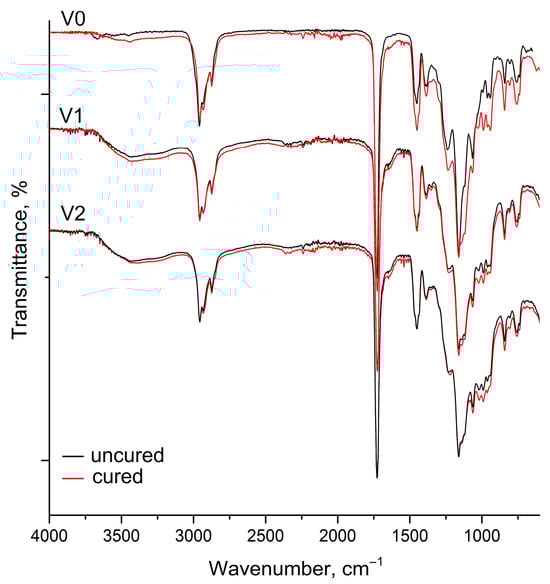 The IR spectra of V-series reactive copolymer-PA blends before and after curing process is shown in Figure 5. In the unmodified VTES-containing binder (V0), curing results in a general increase in the absorption intensity within the 1450–750 cm−1 region, particularly around 1100 cm−1, corresponding to Si–O–Si stretching vibrations. This indicates that alkoxysilane hydrolysis and condensation reactions are activated during the curing process, forming a siloxane network that reinforces the polymer matrix. In PA-modified samples (V1 and V2), this region becomes broader and more intense, suggesting the coexistence of Si–O–Si, Si–O–C, and P–O–Si vibrations. The observed spectral evolution implies that phytic acid participates in silanol–phosphate coordination or condensation reactions, resulting in a denser and more crosslinked hybrid network. Consequently, these chemical interactions are expected to enhance both the structural cohesion and the environmental resistance of the resulting coating films.