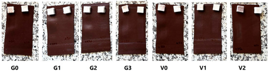 The synthesized reactive acrylic polymer dispersions were evaluated as binders in leather finishing to assess their film-forming and coating performance. To clearly observe the influence of the binders, the finishing formulation was kept as simple as possible (Table 2). PA was incorporated into the reactive polymer dispersions at different levels: for the GMA-containing polymer (G0), PA was added at 5, 10, and 15 wt% based on polymer solids, while for the VTES-containing polymer (V0), additions of 5 and 10 wt% were prepared (Table 3). Incorporation levels above 10 wt% in V0 resulted in stability issues.
