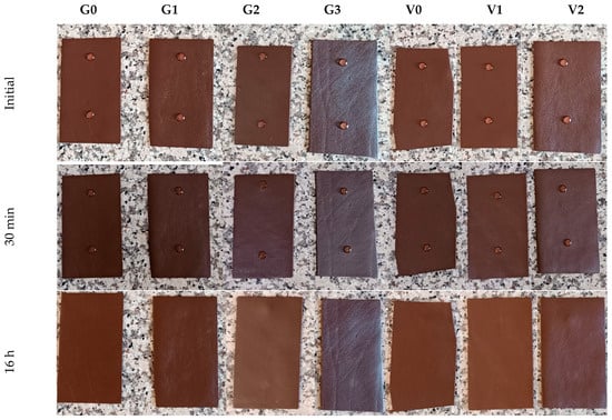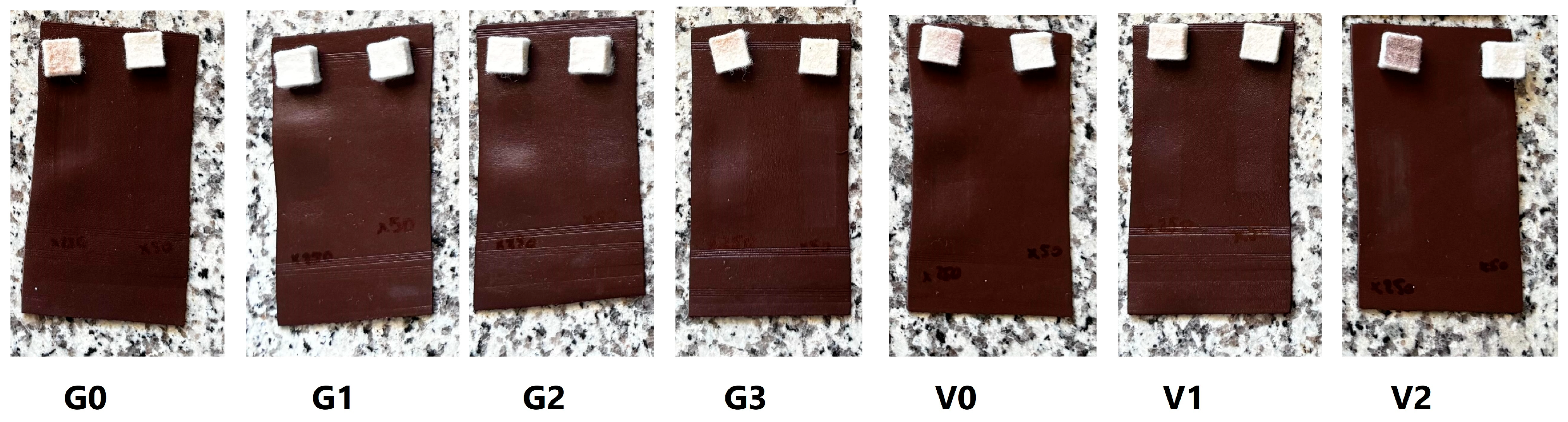 As expected, increasing temperature led to gradual color changes on the leather surfaces. For the GMA-based coatings, the incorporation of PA provided a noticeable improvement in thermal stability, particularly in the formulation containing 10 wt% PA (G2), which showed the best resistance at elevated temperatures. In contrast, PA addition did not produce a significant effect on the thermal resistance of the VTES-based coatings.