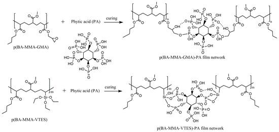 Building on these developments, the present work focuses on the synthesis and application of phytic-acid-modified reactive acrylic binders specifically designed for leather finishing—a field in which phytic acid is introduced for the first time as a reactive, bio-based crosslinking component. While phytic acid has been explored in textile and coating formulations, its incorporation into epoxy-functional (BA–MMA–GMA) and alkoxysilane-functional (BA–MMA–VTES) acrylic latexes represents a novel, environmentally benign strategy to replace conventional toxic crosslinkers. These two reactive systems provide crosslinking and hydrogen bonding mechanisms—epoxy–phosphate interactions in GMA-based copolymers and silanol–phosphate coordination in VTES-based copolymers—enhancing coating cohesion, film integrity, and adhesion to chromium-tanned leather substrate.