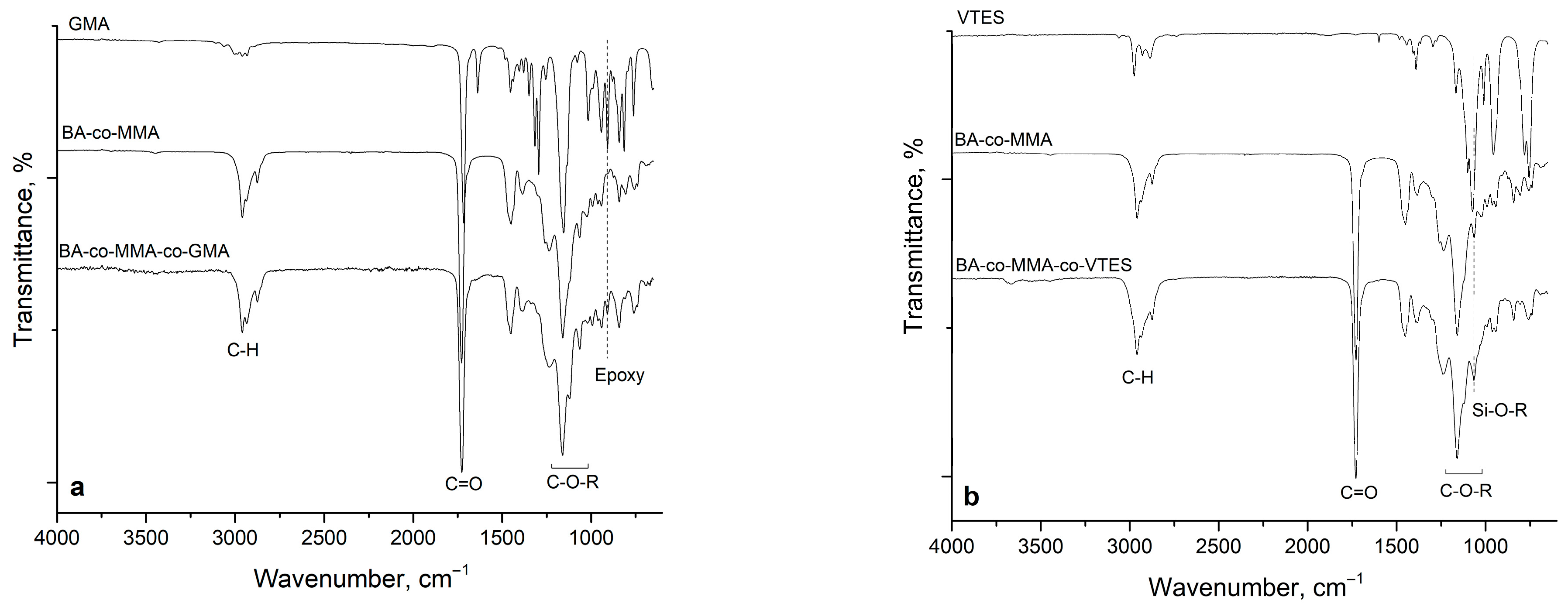 Figure 2. To verify the incorporation of the reactive monomers into the copolymer structure, a reference BA-co-MMA copolymer was synthesized under identical conditions without any reactive monomer. Its spectrum was recorded for comparison alongside those of the functional monomers.