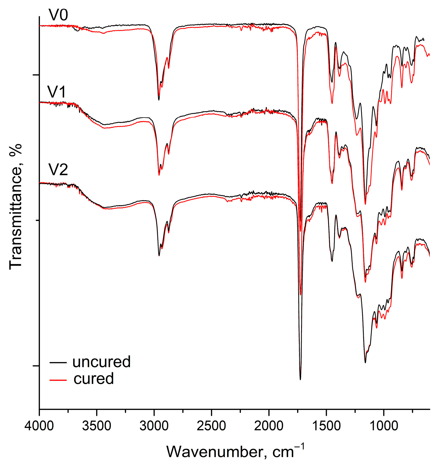 Figure 5. In the unmodified VTES-containing binder (V0), curing results in a general increase in the absorption intensity within the 1450–750 cm