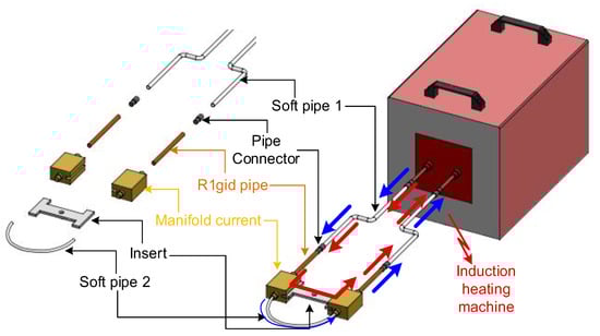 The magnetic induction heating model for mold temperature control (Figure 1) consists of several key components. The induction heating machine supplies a high-frequency alternating current that drives the system. The first soft pipe comprises an outer plastic tube carrying cooling water and an inner copper wire that serves as a flexible electrical conductor; the second soft pipe contains only a plastic tube for water circulation dedicated to heat removal; and rigid pipes and pipe connectors ensure mechanical stability and secure integration of the system. The manifold current distributes and collects the electric current, guaranteeing uniform passage through the insert. The insert itself represents the mold component targeted for localized heating. During operation, cooling water flows through the piping system to regulate the temperature of surrounding parts, while the insert remains uncooled to allow for its efficient heating.
