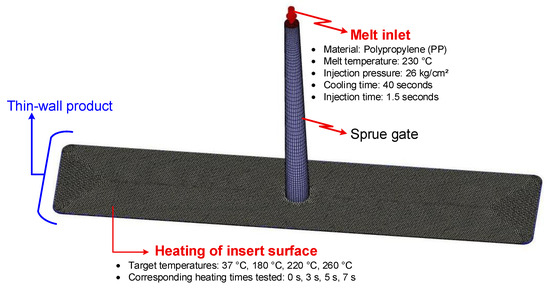 The thin-walled injection molding process assisted by internal induction heating was simulated in detail to analyze the melt flow characteristics and optimize the key process parameters. The simulation framework was developed using Moldex3D, a specialized tool widely applied for polymer injection molding analysis. The geometries of the mold and product were discretized through meshing to convert the physical structures into numerical domains suitable for finite element analysis. The mesh model employed for thin-walled injection molding with internal induction heating is illustrated in Figure 4. Once the model geometry and simulation parameters were fully defined, the injection molding simulations were executed. Upon completion, the results were systematically examined to evaluate flow behaviors and assess the effects of process conditions on filling performance and part quality.