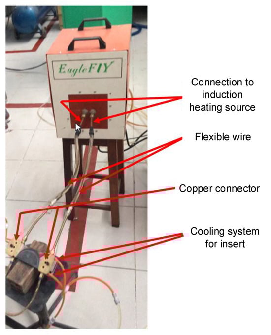 This study focused on investigating the internal induction heating (In-IH) process as an effective approach for controlling the mold surface temperature in injection molding. The heating model used to evaluate the system’s performance is illustrated in Figure 5, while Figure 6 provides a detailed view of the main components, including electrical contacts, copper tubing, rubber hoses, and the connectors to the induction heating power source. The system operates by supplying a high-frequency alternating current to the coil, which generates a strong magnetic field at the insert’s surface. To ensure efficiency and operational safety, water is continuously circulated to cool both the induction unit and the coil. The equipment is capable of delivering a maximum current of 150 A with a peak power output of 30 kW. The detailed technical specifications of the system are provided in Table 5.