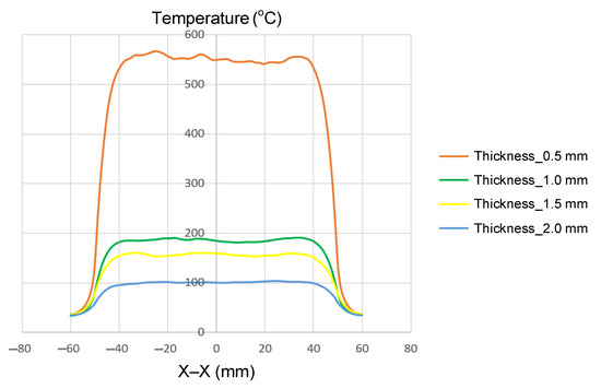 Summary of temperature on the X–X line for the case where the width (W) is 50 mm, the length (L) is 100 mm, and thickness (t) is 0.5, 1.0, 1.5, or 2.0 mm.
