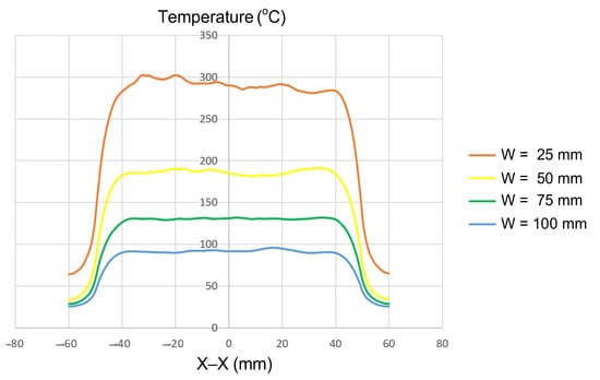 Summary of temperature on the X–X line for the case where the thickness (t) is 1.0 mm, the length (L) is 100 mm, and the width (W) is 25, 50, 75, or 100 mm.