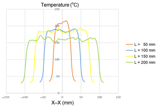 Summary of temperature on the X–X line for the case where the thickness (t) is 1.0 mm, the width (W) is 50 mm, and the length (L) is 50, 100, 150, or 200 mm.