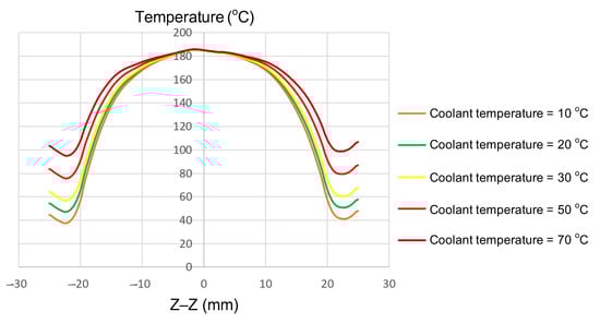 Summary of temperature on the Z–Z line for the case where the thickness (t) is 1.0 mm, the width (W) is 50 mm, the length (L) is 100 mm, and the coolant temperature is 10, 20, 30, 50, or 70 °C.