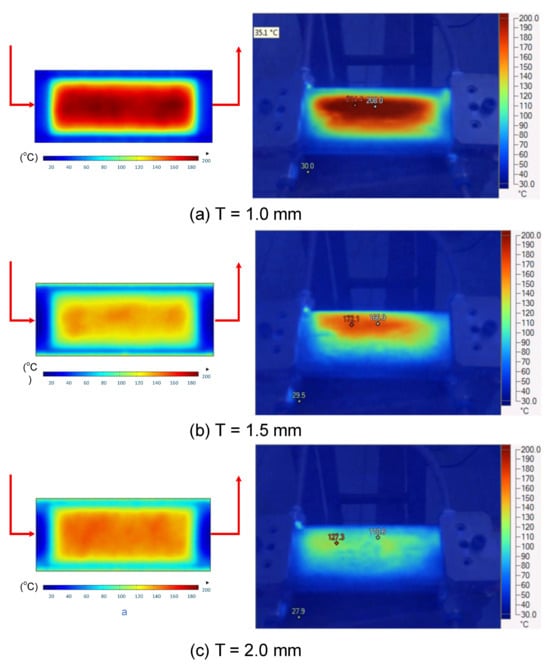 Insert width is one of the most influential geometric parameters governing how induction energy is distributed across the mold surface. In this study, simulations were conducted with a fixed insert thickness of 1.0 mm and a length of 100 mm, while the width was varied from 25 to 100 mm (Figure 2a). The results (Figure 9 and Appendix A Figure A5, Figure A2, Figure A6 and Figure A7, and Table 7) showed a clear dependence of the maximum temperature on insert width. For the narrowest insert (W = 25 mm), the maximum temperature exceeded 300 °C. As the width increased to 50, 75, and 100 mm, the maximum temperature decreased significantly, reaching approximately 190, 140, and 100 °C, respectively. This trend reveals a deeper physical mechanism behind the induction heating process. When the insert width is small, the electromagnetic field becomes more concentrated near the surface, leading to a higher induced current density, and thus, a greater localized heat generation rate. The smaller surface area acts as a confined region for electromagnetic energy, resulting in a rapid increase in temperature and a steeper thermal gradient. Conversely, as the insert width increases, the magnetic flux spreads over a broader area, causing the induced current to distribute more evenly and reducing its density. This dispersion lowers the power density per unit area, thereby decreasing the peak surface temperature and overall heating efficiency.