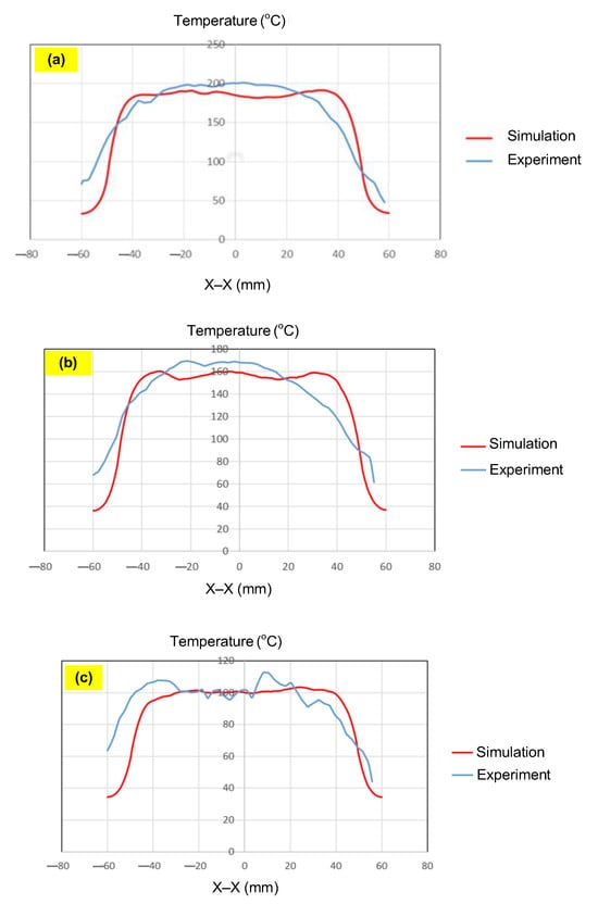 Simulation results and temperature distribution along the X–X line for the case where the thickness (t) is 1.0 mm, the width (W) is 50 mm, and the length (L) is 200 mm.