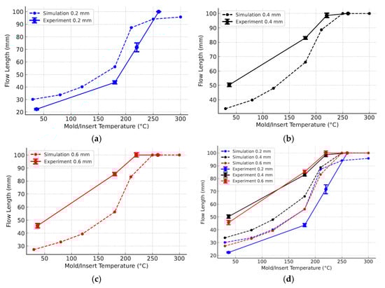 Comparison with the Moldex3D results revealed deviations mainly at low and medium mold temperatures (Figure 15d). For thicker parts, the experiments consistently produced longer flow lengths than the simulations. At 180 °C equivalent, the 0.4 mm specimen reached 83 mm experimentally versus 66.12 mm in the simulation, while the 0.6 mm specimen achieved 85.33 mm compared with 56.23 mm. This difference reflects the limitation of material data in Moldex3D, which is usually obtained at mold temperatures below 100 °C, leading to underestimations of flowability at higher temperatures. In contrast, for the 0.2 mm specimen, the experiments yielded shorter flow lengths than the simulations (43.66 vs. 56.09 mm at 180 °C) due to rapid heat loss and early solidification not being fully captured in the latter.