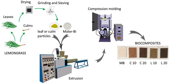 Biocomposites will be identified by codes indicating their composition: L 10, L 20, C 10, and C 20. The letter (L for leaves, C for culms) denotes the lemongrass part used, and the number (10 or 20) indicates the filler weight content. The identifying code MB refers to the neat polymeric matrix. Figure 1 illustrates the schematic diagram of each stage of the manufacturing process.