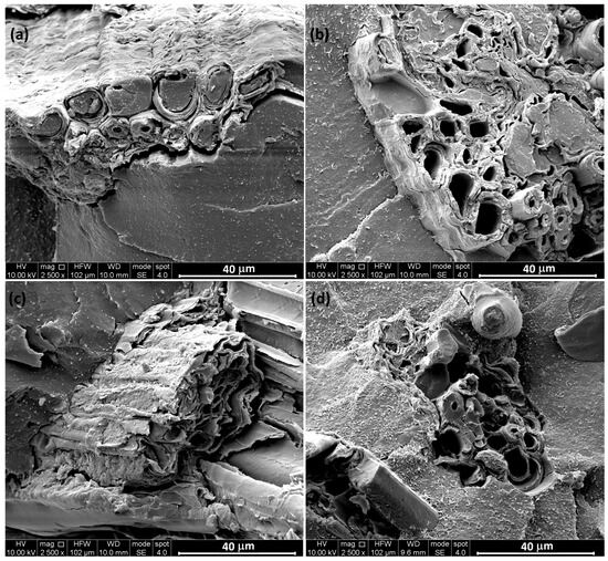 The morphology exhibited by biocomposites is reported in Figure 2 and Figure 3, where the surface of nitrogen-fractured samples is observed at different magnifications. The SEM micrographs presented in Figure 3 provide compelling evidence that in every analyzed sample, the polymeric matrix successfully infiltrated and filled at least a portion of the fiber lumens. This suggests effective impregnation of the reinforcing fibers by the polymer during the composite fabrication process, which is critical for ensuring good interfacial adhesion and mechanical performance.