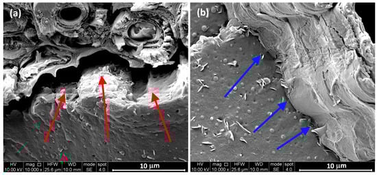 Moreover, a closer view of the fractured surface of 10 wt.% loaded biocomposites (Figure 4) provides a detailed visualization of the filler–matrix interface. It is worth noting that the leaf-derived particles show an enhanced interfacial adhesion to the polymer matrix in comparison to their culm-derived counterparts. Indeed, an evident gap between the culm-particle surface and the surrounding matrix (highlighted by the red arrows) can be observed in Figure 4a, indicating weak fiber-matrix adhesion. Conversely, Figure 4b clearly shows the presence of a layer of matrix adhering to the leaf-particle surface (highlighted by the blue arrows) even after the composite failure.