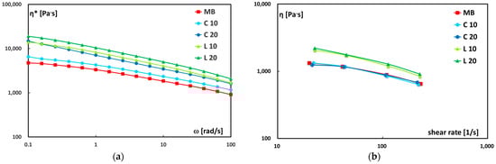 (a) Complex viscosity (η*) vs. frequency (ω) and (b) shear viscosity (η*) vs. shear rate () for neat Mater-Bi and its biocomposites.
