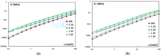 (a) Storage modulus (G′) and (b) loss modulus (G″) vs. frequency (ω) for neat Mater-Bi and its biocomposites.