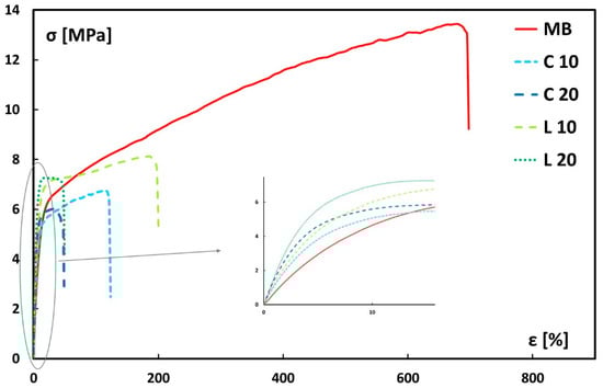 Representative tensile stress–strain curves for neat Mater-Bi and its biocomposites are shown in Figure 7.