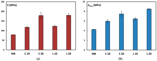 Regarding the flexural behavior of the compared biocomposites, since no specimens failed during the three-point bending test, the discussion will focus on the maximum flexural stress and flexural modulus. The mean values and standard deviations of these flexural properties are reported in the histograms shown in Figure 8a,b.