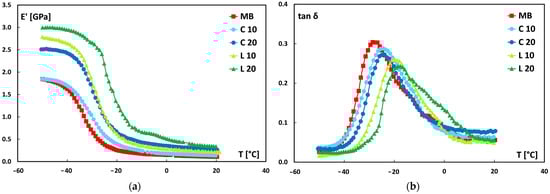 The storage modulus (E′) and damping factor (tanδ) trends with temperature for all samples were obtained from dynamic mechanical characterization, as shown in Figure 9.