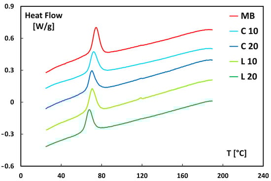 The presence of the filler appears to hinder the crystallization process, likely by interfering with the orderly rearrangement of macromolecular chains, thus requiring a greater degree of undercooling to complete crystallization. This behavior can be attributed to the low nucleating efficiency of the filler within the matrix. Moreover, the area under the crystallization peak of the calorimetric curves for lemongrass particles reinforced biocomposites, directly related to the crystallization enthalpy (ΔHc), is lower compared to that of neat Mater-Bi. This finding suggests a reduced crystallization ability of the biocomposites compared to the neat polymer matrix. This effect is likely due to the lignocellulosic particles restricting polymer chain mobility, thereby hindering their ability to align and form an ordered crystalline structure. A similar behavior was found in polymer-based composites reinforced with natural fibers and/or fillers [51].