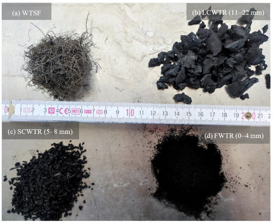 Waste materials used in the concrete: (a) Recycled waste tire steel fibers (WTSF); (b) Large coarse waste tire rubber (LCWTR); (c) Small coarse waste tire rubber (SCWTR); (d) Fine waste tire rubber (FWTR).