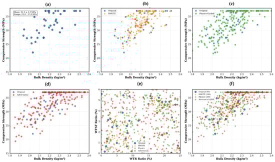 where βdensity = 25 MPa·m3/kg represents the density-strength coefficient; βWTR = −0.3 MPa/% accounts for WTR degradation effects; βWTSF = 0.1 MPa/% captures steel fiber reinforcement; and ε ~ N (0, 0.03fc) represents measurement uncertainty. And, here, fcsynthetic represents the synthetically generated compressive strength, while fcbase denotes the experimentally measured base compressive strength of the concrete mixture. βdensity, βWTR, and βWTSF are the coefficients representing the effects of density, waste tire rubber content, and waste tire steel fiber content, respectively. and correspond to the incremental changes in density (kg/m3), WTR ratio (%), and WTSF ratio (%), respectively, relative to the base mixture. Physical constraints ensured density variations within ±5%, WTR ratios between 0 and 25%, and WTSF ratios between 0 and 6%. This methodology generated 200 samples with enhanced coverage of the feasible design space (Figure 3c). Adversarial augmentation, feature space coverage, and combined dataset are also given in Figure 3d–f.
