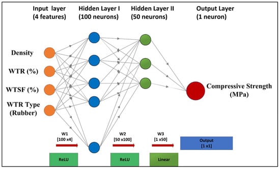 Here, the first derivative term quantifies the sensitivity of the predicted compressive strength to changes in bulk density, while represents the rate of change of predicted strength with respect to the waste tire rubber content. The model hyperparameters were tuned using Bayesian optimization in Optuna (100 trials). At the same time, the search adjusted the learning rate (0.0001–0.01), physics-based regularization coefficient λ (0.01–1.0), and L2 penalty term (10−5–10−2). Based on the smallest composite validation loss under 5-fold cross-validation, the recommended settings were λ = 0.1, learning rate = 0.001, α = 0.001, and architecture [4–100–50–1]. Using a methodical approach, the physics-based regularization weight λ was determined rather than assigned heuristically.