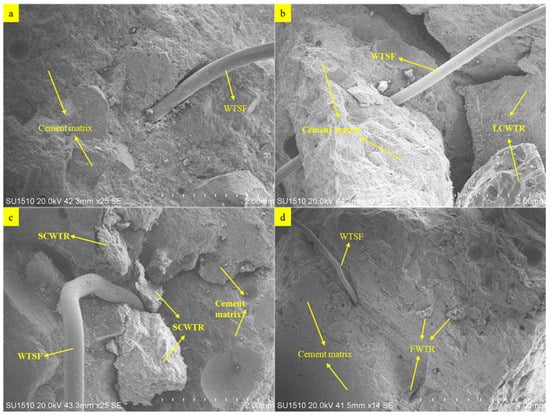 The SEM image, at a magnification of 25×, is presented in Figure 5a for a concrete sample containing only WTSF. The recycled steel fibers equally dispersed in the cement matrix due to the adequate mix procedure, ensuring better contact with the matrix. Excess alkalinity in the hydration products could be seen around the fibers, which enhance the mechanical interlocking action resisting the fibers’ pullout and limiting crack propagation—a mechanism in line with the strength increases measured experimentally. The use of 0.5–1.0% fiber additives effectively integrated the fibers into the matrix, contributing to integrity without increasing porosity. In the mixture containing LCWTR (Figure 5b), the rubber particles are larger and more porous, but the bond between the fiber and the matrix is largely preserved. The irregular surface structure of LCWTR, while contributing to physical interlocking, caused local voids in some areas. In the SCWTR added sample (Figure 5c), the flat and sharp-edged rubber particles create localized separation within the matrix, paving the way for microscopic crack formation, particularly around the fibers. This weakens the fiber’s contact with the cement matrix, negatively affecting interface continuity. In the FWTR-added sample (Figure 5d), microstructural deterioration became more pronounced. The uneven distribution of fine rubber particles increased porosity in the cement matrix and created segregation zones around the fibers. Weak fiber-matrix interlocking prevents homogeneous hydration of FWTR.