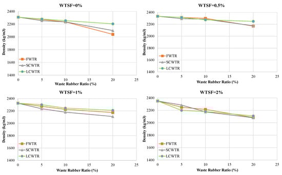 Effect of different WTR types and replacement levels on concrete density at varying WTSF dosages.