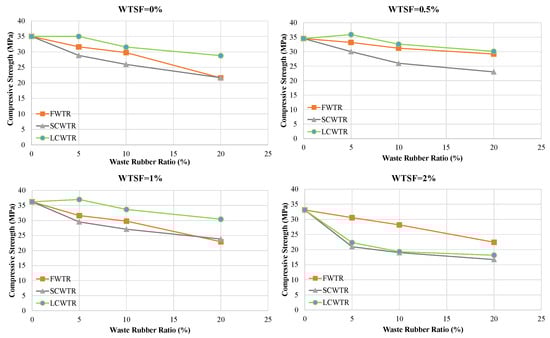 Influence of increasing WTSF content on compressive strength at different WTR replacement ratios.