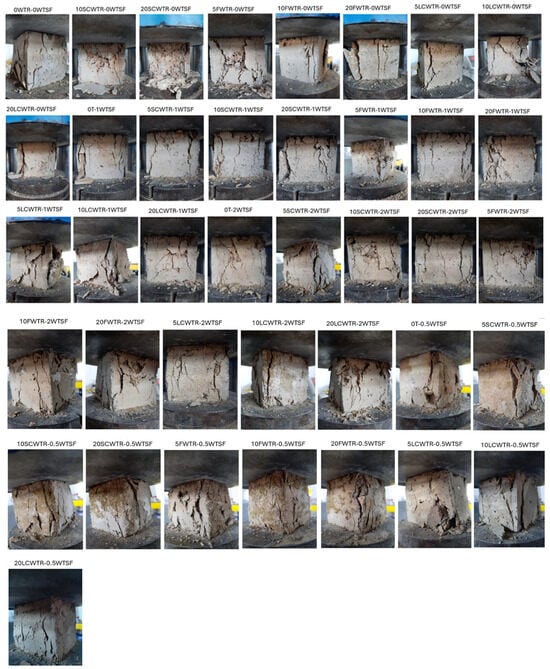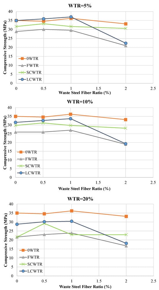 - The highest compressive strength was obtained in the 5LCWTR–1WTSF mixture, while the lowest strength was measured in the 20FWTR–2WTSF mixture.