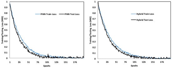The comparative analysis of the PINN and the proposed Hybrid PINN–CatBoost model over 200 training epochs indicates significant differences in convergence stability and predictive accuracy. The training and testing loss curves (Figure 10) demonstrate that the Hybrid model consistently attained lower error rates and exhibited smoother convergence, whereas the standalone PINN displayed oscillatory behavior and a slower stabilization process.