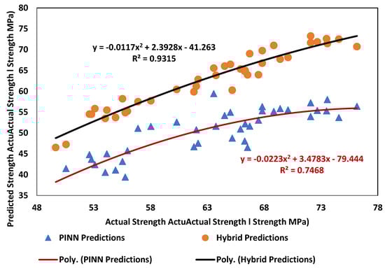 Figure 14a,b depict these results. Hybrid forecasts align more closely with actual values, but PINN predictions exhibit systematic underestimations and increased volatility. This aligns with previous studies illustrating the advantages of hybrid and ensemble learning approaches. Tipu et al. [54] demonstrated that ensemble machine learning models had enhanced predictive accuracy (R2 = 0.9876) for concrete compressive strength across diverse mix compositions. Zhang et al. [52] and Elhishi et al. [55] also indicated that ensemble approaches, namely XGBoost and LightGBM, markedly enhanced prediction accuracy in high-performance concrete applications, surpassing individual regression models. Moreover, physics-informed neural networks (PINNs) are increasingly being utilized in cementitious systems. Rahman et al. [56] used PINN-CHK to simulate cement hydration kinetics, attaining physically consistent and very precise predictions of early-age temperature increase, with a relative L2 error as low as 0.00341. Varghese et al. [57] illustrated the effectiveness of physics-informed frameworks for optimizing concrete manufacture by integrating physical rules into neural networks to forecast concrete strength with minimal inputs. These studies validate the methodological justification for integrating physics into machine learning models for cementitious materials.