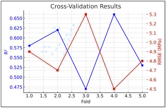 The predictive efficacy of the proposed hybrid physics-informed neural network (PINN)–CatBoost model was meticulously tested using several statistical methodologies, including stratified 5-fold cross-validation, bootstrap resampling, non-parametric significance testing, and effect size metrics. The cross-validation analysis (Figure 12) revealed that the model obtained an average R2 of 0.574 ± 0.153 and an RMSE of approximately 4.82 MPa across folds, signifying adequate generalization. Previous work indicates that machine learning models for concrete parameters typically provide R2 values within comparable ranges. For example, Huang et al. [50] showed that optimized artificial neural network models can accurately forecast the compressive strength of rubber concrete.