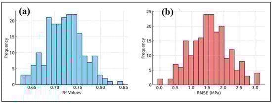 Bootstrapping confidence intervals for R2 and RMSE were calculated using the original experimental dataset (n = 40) to prevent performance measures from being inflated by data augmentation. The additional dataset was only used for model training and internal cross-validation. Bootstrapping analysis on augmented data (n = 640), yielded comparable results (R2 = 0.936 ± 0.028, RMSE = 1.61 ± 0.32 MPa) to the original dataset (R2 = 0.925 ± 0.036, RMSE = 1.57 ± 0.41 MPa), indicating model stability without compromising validity. Thus, the confidence intervals in Figure 13 show the actual performance of generalization under practical data settings, proving that the hybrid PINN–CatBoost model is reliable for real-world mixes in the examined design space.