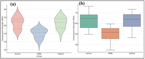 (a) Comparison of Actual compressive strength, PINN predictions, and Hybrid predictions using violin plots, (b) distribution comparison of Actual, PINN, and Hybrid predictions using box plots with quartile markers.