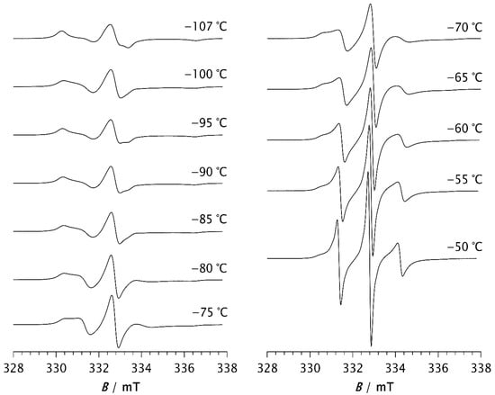 At −50 °C, the fast component becomes very pronounced. As the temperature increases further, the slow component disappears, so that the spectrum at −30 °C consists of three well-resolved narrow lines, as seen in Figure 2. This change can be associated with the melting of the crystalline phase and its transition to the amorphous phase (see thermal analysis results below). At temperatures above −30 °C, the line width increases with increasing temperature. It is known that at short correlation times, as long as τR < 0.02 ns, the contribution of spin rotation to the transverse relaxation rate (T2−1) dominates. At longer τR values this contribution becomes less significant, and the rotational modulation of the 14N hyperfine and g tensors anisotropies begins to dominate [36]. This effect becomes increasingly pronounced with rising temperature up to 20 °C, as seen in Figure 2.