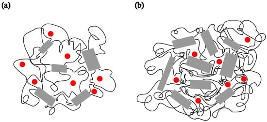 Schematic representation of a semicrystalline PDMS matrix and the distribution of the spin probe (●) inside the amorphous region of PDMS at −85 °C (a) after 2 min and (b) upon reaching steady state.