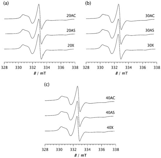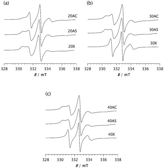 ESR spectra of the spin probe in PDMS composites: (a) 20AC, 20AS, and 20X; (b) 30AC, 30AS, and 30X; (c) 40AC, 40AS, and 40X. The spectra were recorded at −85 °C after the time t required to reach the steady state.