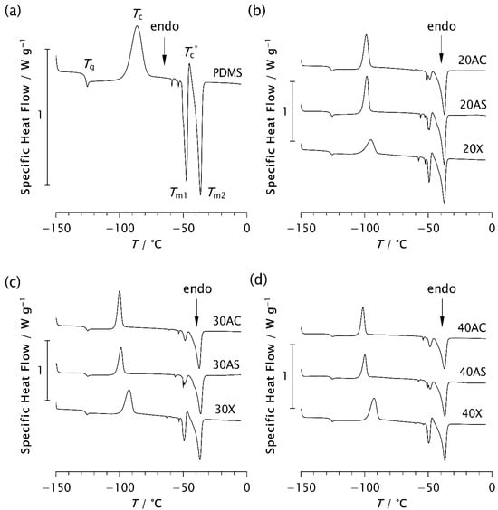 Sample 40AS is characterised by the lowest ΔHc value, as shown in Table 4, and, consequently, the highest degree of crystallinity during cooling (Δχ = 43.42%), as shown in Table 5. This can also be attributed to the high roughness of its outer surface [29], as discussed earlier. It is worth noting that only 16.56% of more perfect crystals are formed during rapid cooling of pristine PDMS.